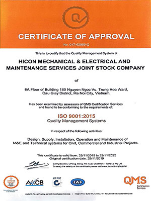 HICON M&E一直采用ISO 9001:2015质量管理体系以提高项目管理效率、确保向客户按期交付优质及安全的工程。