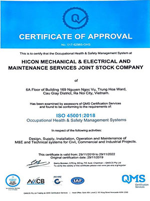 以安全为首要考虑因素政策,HICON M&E一直采用ISO 45001:2018管理体系以确保员工的健康和安全。